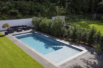 Zwembaden van 2,4 x 5 m tot 4,7 x 12 m (binnenmaat), de ideale oplossing overal waar de beschikbare ruimte zo goed mogelijk moet benut worden.